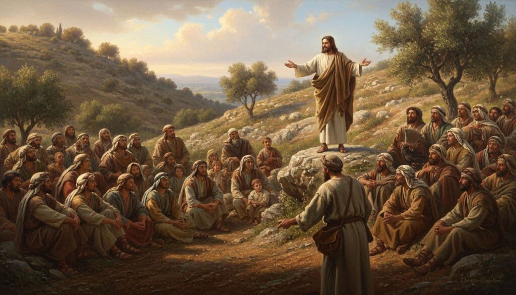 Jesus teaching a crowd outdoors, with the parable of the sower pictured in the scene.